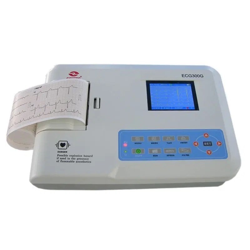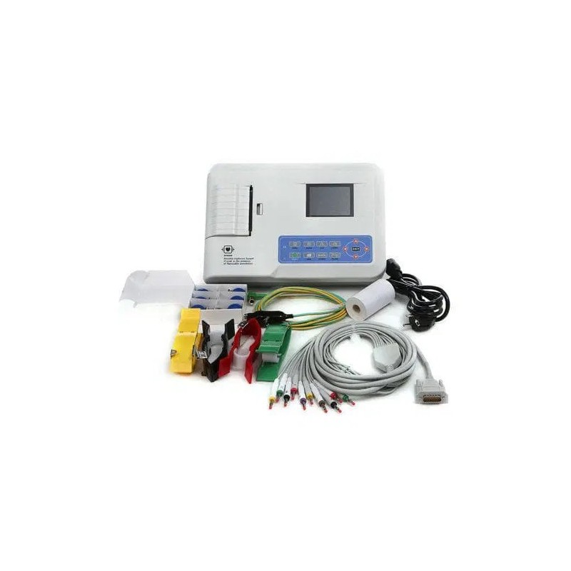 Eletrocardiógrafo Contec 300G de 12 derivaciones, 3canales de visualización, interpretativo y dotado de impresora.